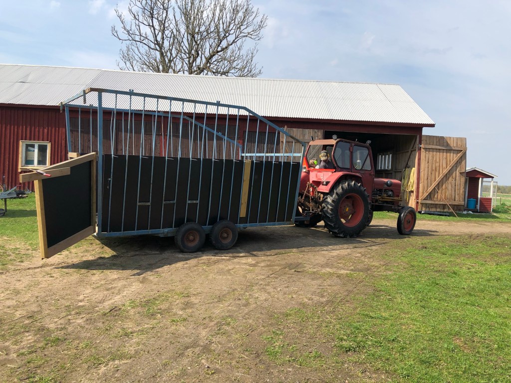 När det var klart lekte jag och barnen i trädgården och Axel satte igång med att svetsa fast den nyinköpta kroken på fårkärran. Det blev paus för pannkakslunch och sen gjorde han klart det under eftermiddagen. Så nu går den att dra med traktorn! Nu ska vi bara sätta på någon slags hasp på dörrarna också så är Lammborghinin klar!