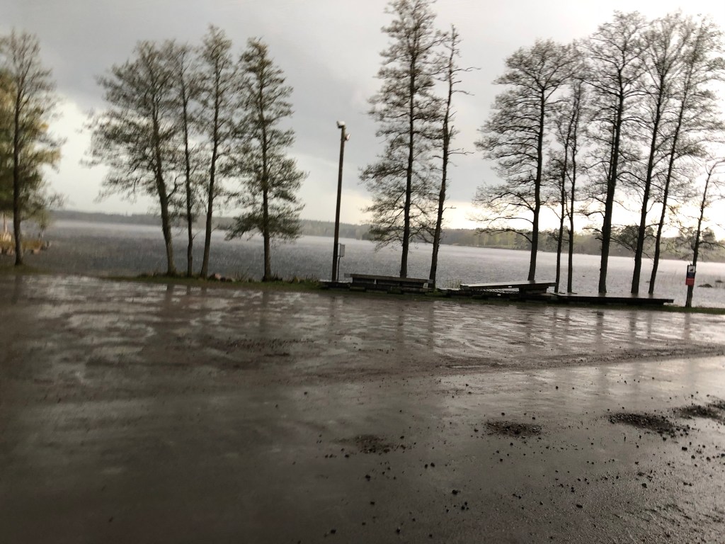 Solen sken och himlen var blå. Åskan mullrade dock på avstånd och vi fick några droppar regn på oss när vi ridit halvvägs. Ingen fara dock. Men sen! När vi hade ca tre kilometer kvar öppnade sig himlen och regnet öste ner. Vi blev helt genomblöta in på bara skinnet. Det droppade om både trosor och strumpor när jag kom in!!