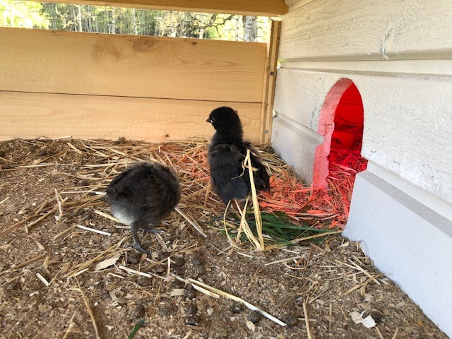 Igår fick kycklingarna flytta ut till kaninburen som ju står tom just nu. Värmelampa i lilla hus-delen men de kan välja att gå ut och vänja sig vid kallare temperaturer i resten av buren, och krafsa lite i spånet. Den gula kycklingen dog tyvärr förra helgen, den låg död en morgon, oklart varför. Men de två svarta är pigga och glada! Även de två kycklingarna ute hos sina mammor växer och frodas. Och vi har en höna som ligger på tio ägg från Tilda också! Hon la sig platt på några av våra ägg någon dag innan Tilda, som också har Hedemora-höns, frågade om vi ville byta ägg. Så hon fick dem som hönan låg på, och så la vi dit ett gäng av deras hönsägg. Kul med lite nytt blod i flocken! I fredags la vi dit äggen så beräknat kläck blir väl runt fjärde juni.