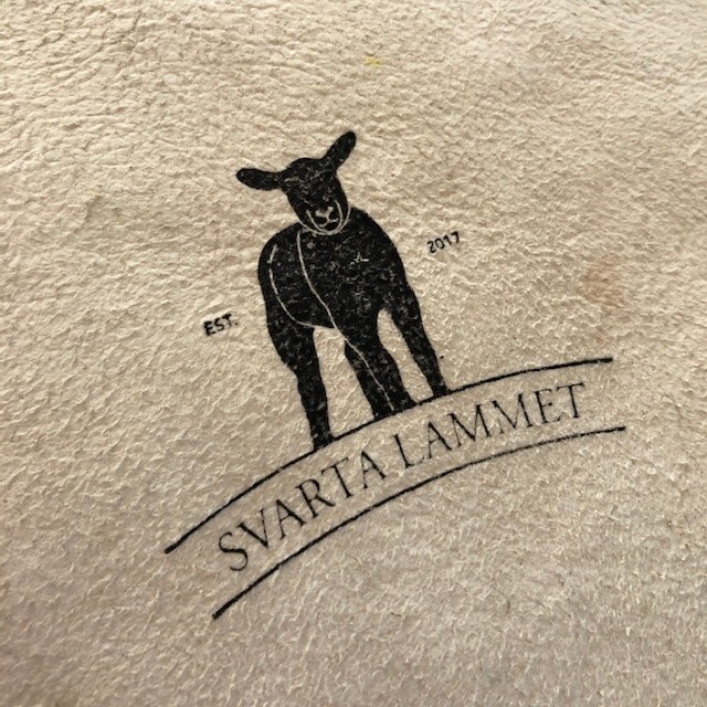 Och fåren käkar och växer, de minsta lammen är snart en månad gamla. Nästa helg flyttar vi dem till nya hagen som vi grejat med, så hagen vid huset kan växa upp igen till hästarnas tur. Minns ni att vi gjorde en logga till vår får-verksamhet? Den skickad vi in till ett företag som tillverkar stämplar, den kom på posten igår och vi prov-stämplade på vårt eget lammskinn här hemma. Kolla vad fint!! Så nöjd!