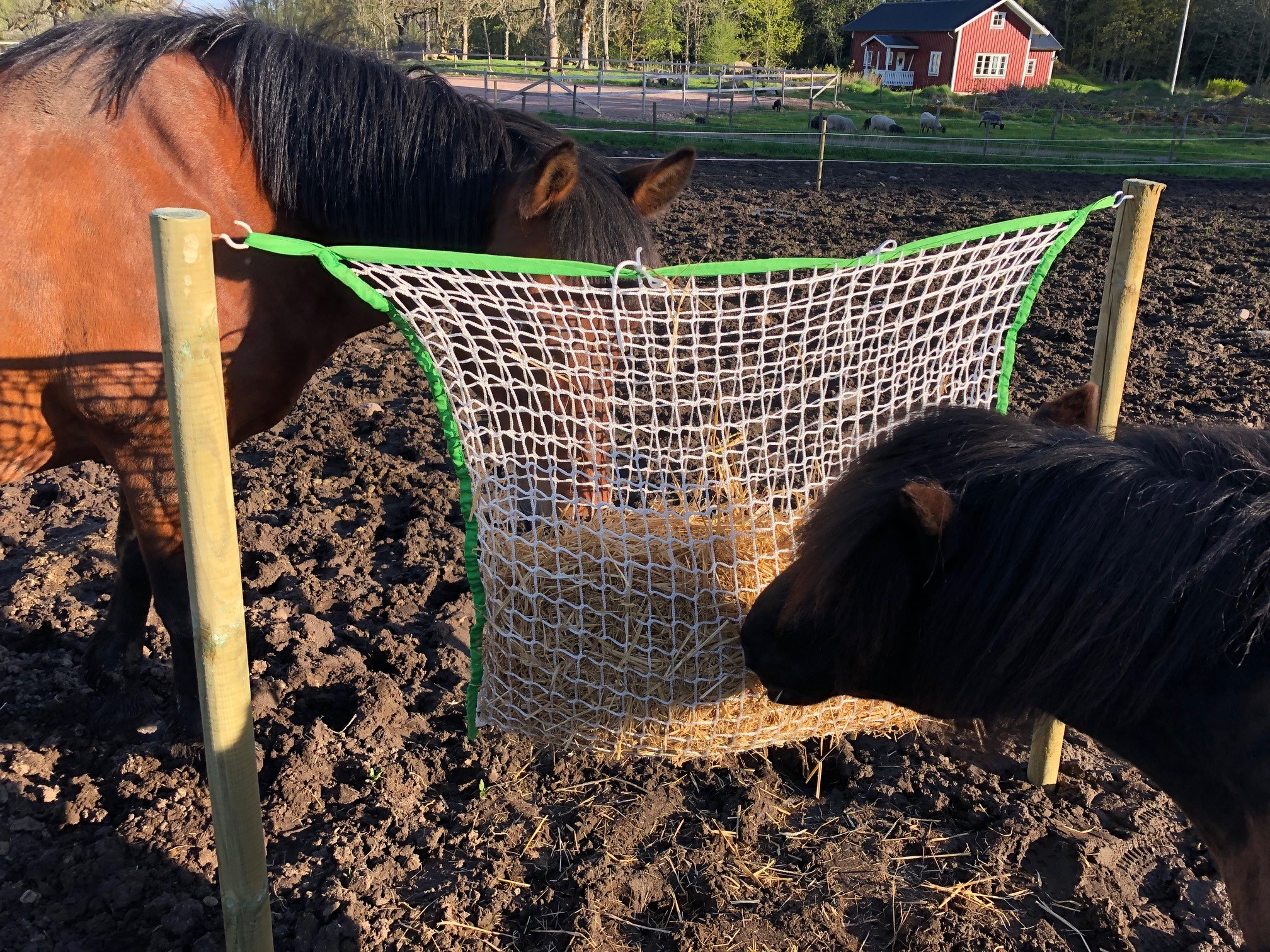 Solen skiner och torkar upp hagarna med rasande fart, härligt! Leran blir allt mindre kladdig och gräset växer. Bra för alla djur, förutom ponnysarna som ju står på bantning. De får nöja sig med hö i begränsade mängder, och halm för att fylla upp lite. Igår fick de en ”matstation” i hagen så de har lite att pyssla med en stund.