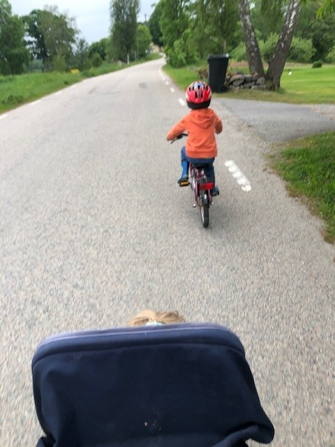 I dag hade Axel tandläkartid strax efter sju så jag åt frukost med barnen och lämnade Loke på förskolan innan Axel bytte av mig här hemma och jag kunde gå en trappa ner till jobbet. Mysigt att göra det igen! Loke ville såklart cykla men jag och Nora tog barnvagnen. Loke var jätteduktig och cyklade långsamt så jag hann med (annars är det full fart som gäller helst!) och han höll sig fint intill kanten också. Han levlade självmant upp till en modell större cykel tidigare i veckan efter att ha längtat och längtat, och han bevisar gång på gång att han klarar den utan problem.