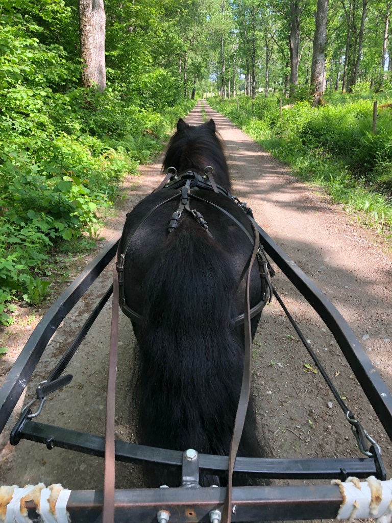 Nora somnade i bilen på vägen hem och jag och Loke tog tag i lite gårdsgöra. Harvning av paddock nämligen! Vi lyckades koppla av betesputsen, starta traktorn och koppla harven. Sen var det ju bara att köra. När vi var klara väckte vi Nora och packade lite frukt och tog en sväng med ponnyvagnen. Det var länge sen vi satt bakom den här goa rumpan.