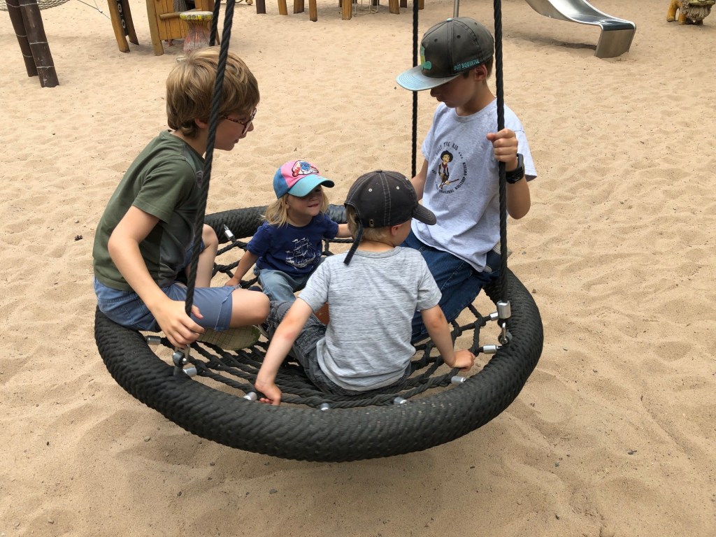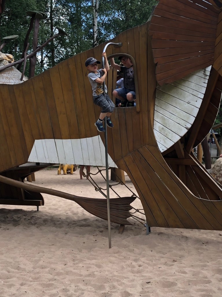 Därefter var det björnar och älgar bland annat, och sen var vi framme vid den stora lekplatsen, som nog var det barnen såg fram emot mest. Nora ropade ”haa-aaa, haa-aa!” och ville därmed gunga, såklart. Först i egen gunga och sen hängde hon med de stora barnen i kompisgungan.