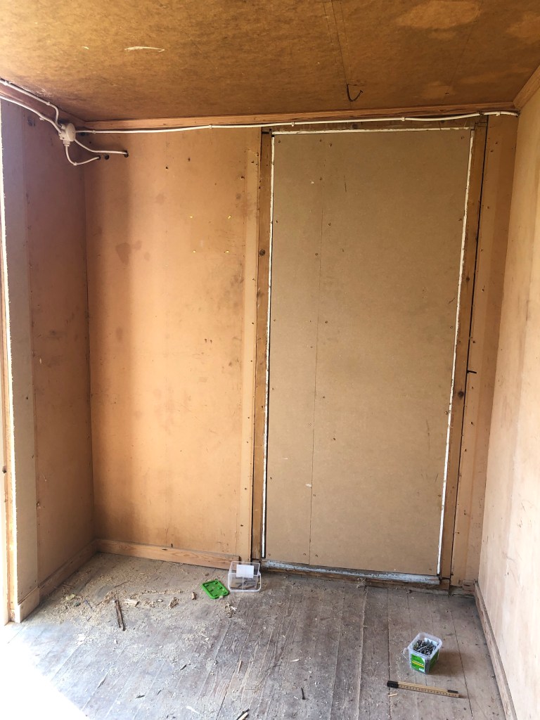 Han har satt igen dörrhålet in mot det stora rummet och snyggat till karmen på insidan av den nya dörren.