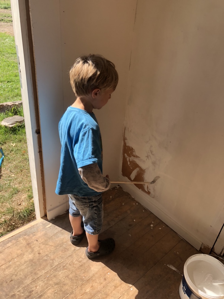 Efter frukost tog Axel med sig barnen och handlade och jag fortsatte måla i sadelkammaren. Väggarnas tur idag! När handlingen var avklarad fick jag målningshjälp, av Loke!