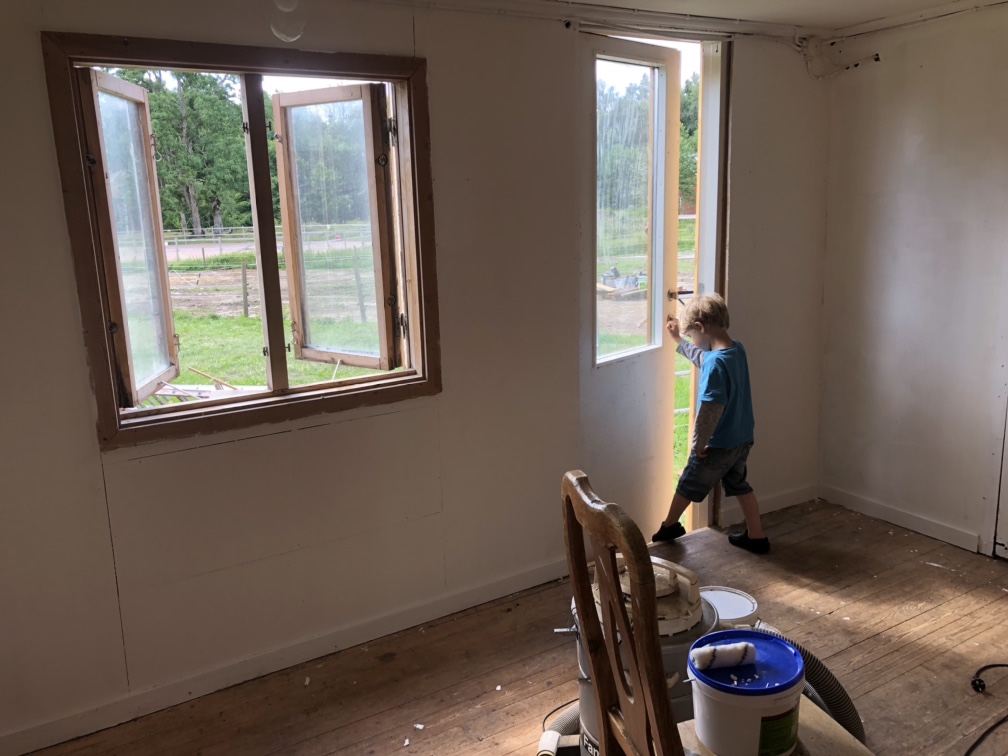 Axel lagade ett gammalt råtthål i golvlisten också. Härnäst ska det målas lager nummer två två väggar och golv, och sen ska den omålade väggen få panel på sig. Vi har kvar tre paket med panel från sovrumsrenoveringen som vi tänkte passa på att ”göra oss av med”. Kanske laserar det brunt också?