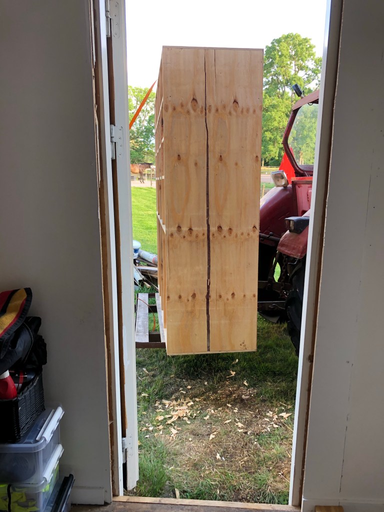 Axel jobbade vidare på nästa inredningsmöbel i sadelkammaren, nämligen skåp! Och efter hagbyte på både tackor och lamm (i olika omgångar), blev det dags för skåpet att flytta in i sadelkammaren. Traktorn och Nils hjälpte oss! Det var ju ingen liten pjäs…
