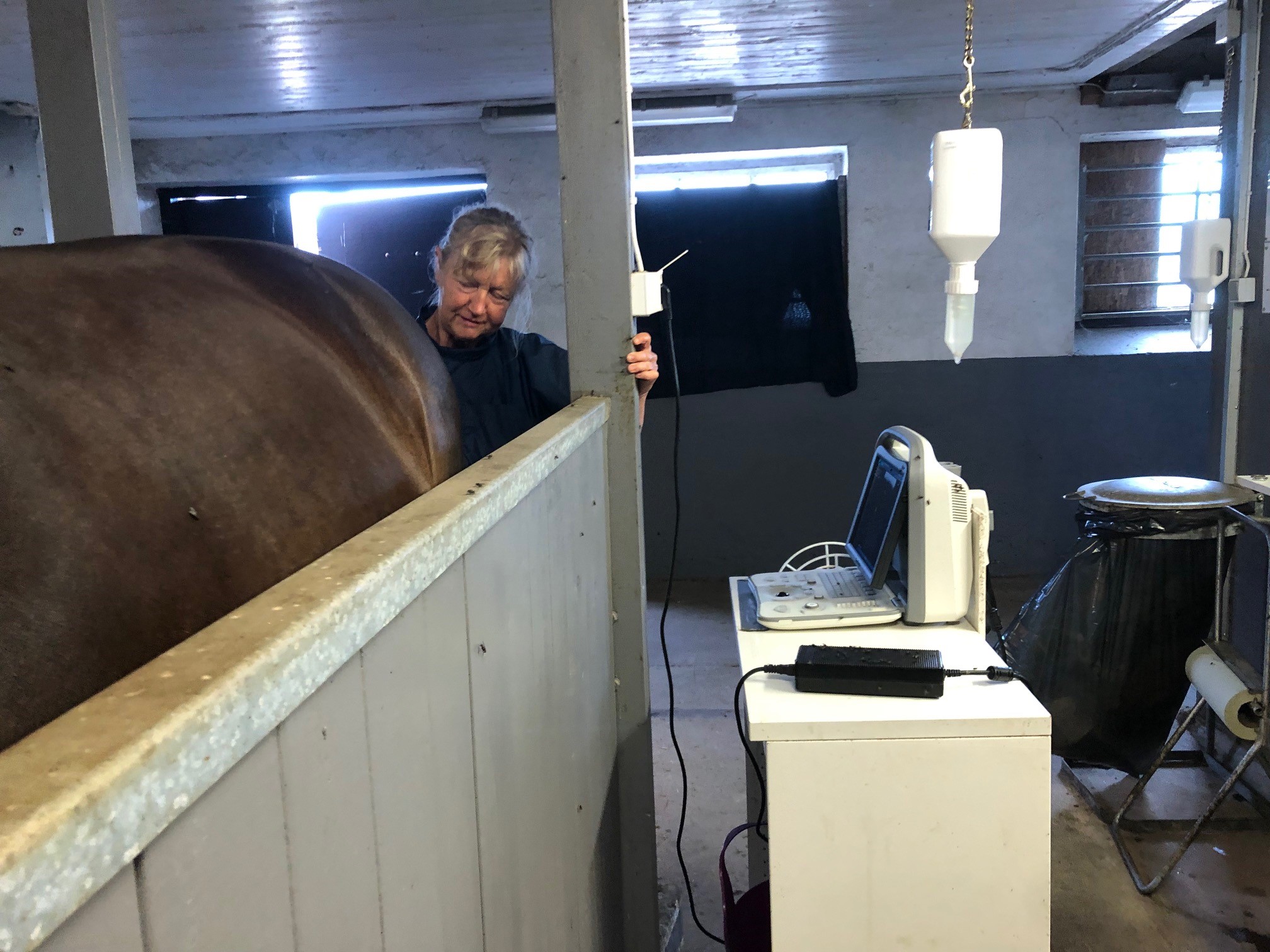 - Hon är dräktig, men fosterblåsan ”gömmer sig”. En anledning till att man inte hittar den skulle kunna vara att hon släppte ytterligare ett ägg i samband med insemineringen, och att det är det ägget som har blivit befruktat. I så fall skulle hon kunna vara lite senare i cykeln än beräknat. Sen har hon också en livmoder som lutar lite, och det är därför svårt att se hur den ser ut ”längst bak” om jag förstod det rätt. Hon var ju såklart kissnödig också, som alla andra gånger, och fick pausa i en box för att kissa innan veterinären kunde kika vidare.