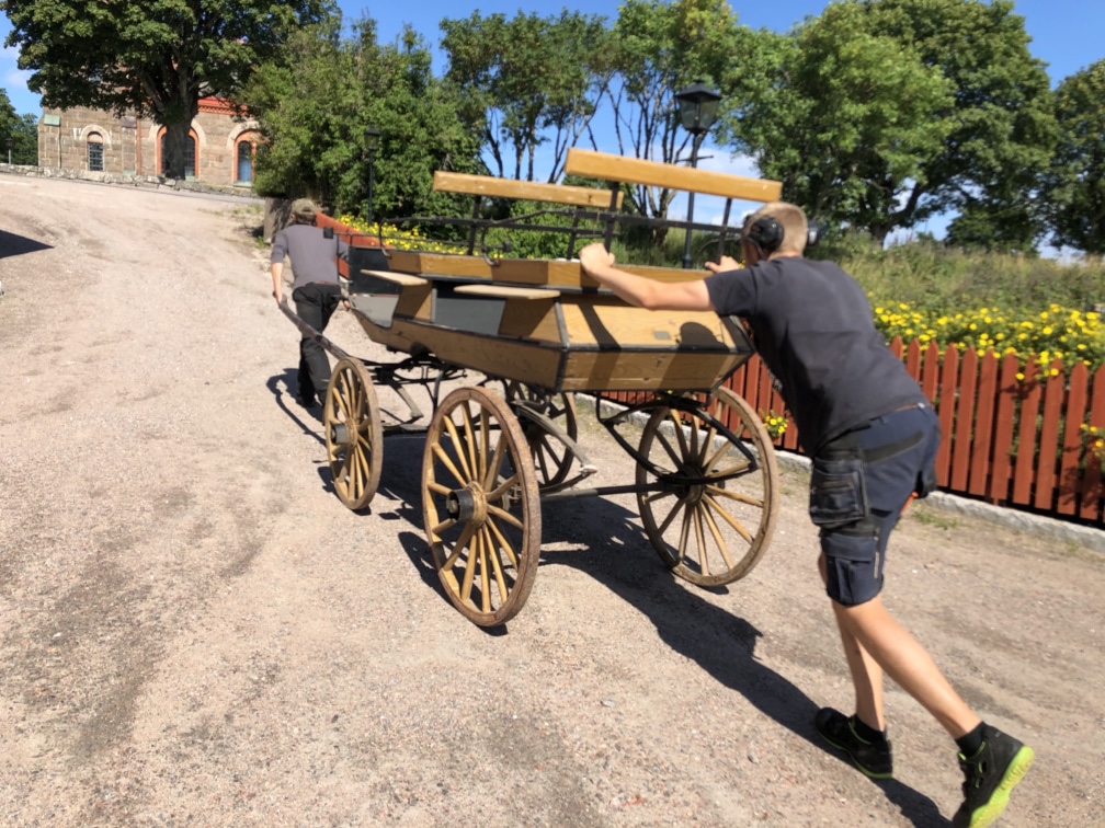 Under förmiddagen gick vi bort till gården uppe vid kyrkan och rullade ut en stor vacker fyrhjulig gammal hästvagn som vi fått. Ja ni hörde rätt, fått! Helt fantastiskt snällt och roligt. Vi fick hjälp att rulla den upp från gårdsbacken och sen kastade vi upp barnen i vagnen och drog hem den.
