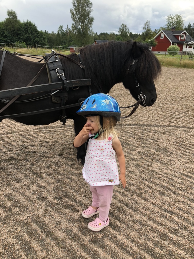 När barnen somnat gick jag ut till stallet. Klart Kaprifol skulle få bekanta sig lite med den där vagnen! Hon har ju dragit ett par grejer (däck, tvåhjulig vagn, släde) men det har aldrig blivit nåt mer än ett test-åk, så hon har ju inte riktigt någon vana med det hela. Men hon brukar ju ”finna sig” i det mesta som jag hittar på. Först fick hon gå bredvid när jag drog vagnen inne på ridbanan. Den skramlar ju rätt ordentligt så det är mycket ljud, men den är ganska lättrullad och svänger fint. Efter några varv spände jag för Kaprifol och så gick vi lite lugnt runt banan. Fickorna var fulla med äppelbitar som hon fick smaka på, hon blir ju dock lite ”på” när hon får så mycket gott på en gång så det gick nästan bättre när mutorna var slut.