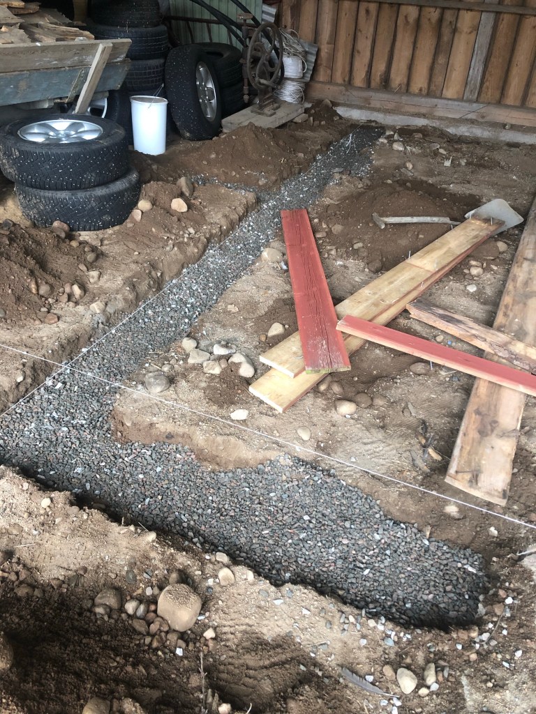 Som ballast använde vi både det som vi grävt ur rännan, och gruset som vi fått levererat. Vi blev lite svettiga ett tag så det såg ut som cementet inte skulle räcka, men det gjorde det! Det blev tillochmed en dryg halv skottkärra över så vi grävde snabbt ur en ruta vid hålet under dörren till den nya sadelkammaren, grusade botten och gjorde en fin liten ”betongplatta” där på marken.