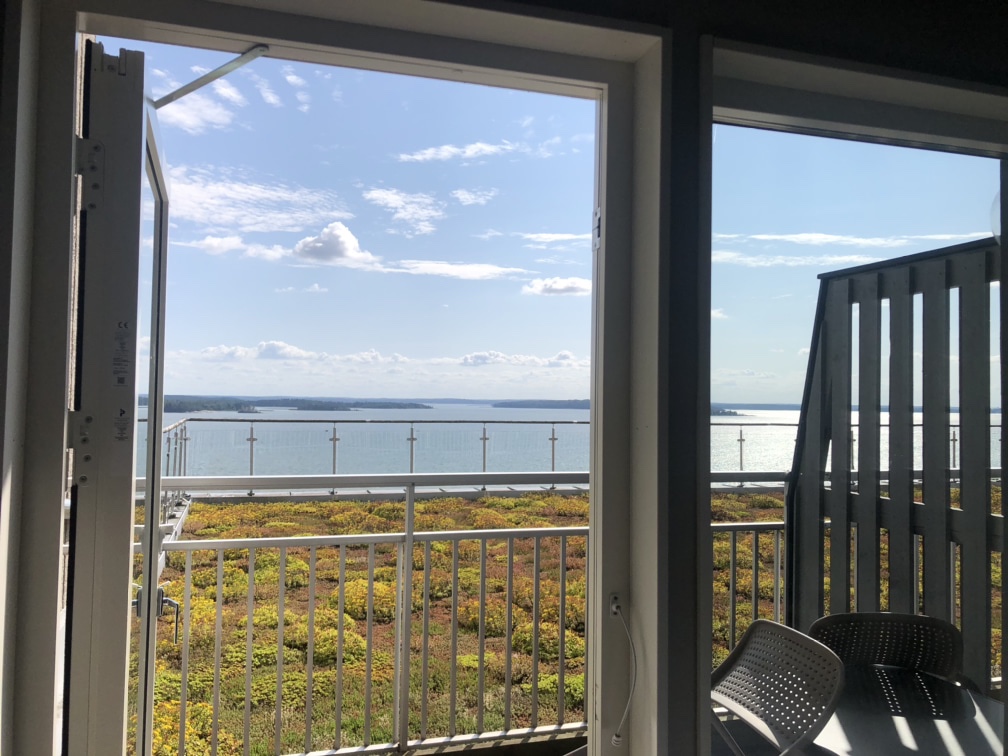 När badet var slut blev det pyjamas, lite kort ”barnbio” och sen bums i säng! Mamman och pappan laddade upp för morgondagen på balkongen. A room with a view!