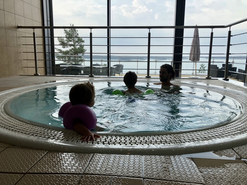 Vi avslutade med att värma oss i den varma bubbelpoolen. Det var inte precis kallt i det andra vattnet, men Nora blir snabbt kall ändå.