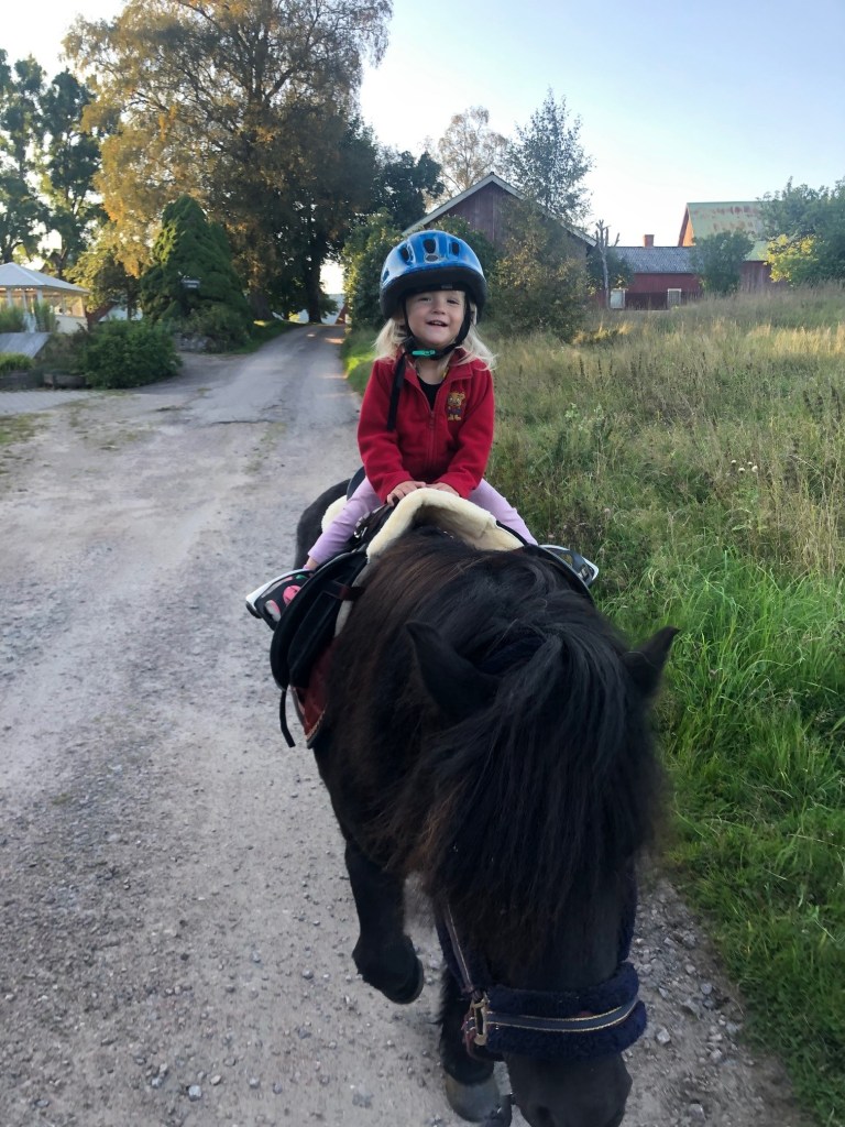 Vi cyklade hem, Loke på egen cykel och Nora i cykelstol. Och sen lämnade jag över barnen till Axel och gick ner i källaren för ett sista möte innan jobbdagen var slut. När vi sågs igen var det dags för middag och nu var energinivån väldigt låg. Nora vägrade äta (men hade fikat två gånger under em så hon var väl inte hungrig) och Loke hade en lång startsträcka innan han började peta i sig lite mat. Efter middagen åkte Axel och Loke och tittade till lammen och hämtade en påse hö hos grannen, och jag och Nora gick på en kortkort ponnypromenad.