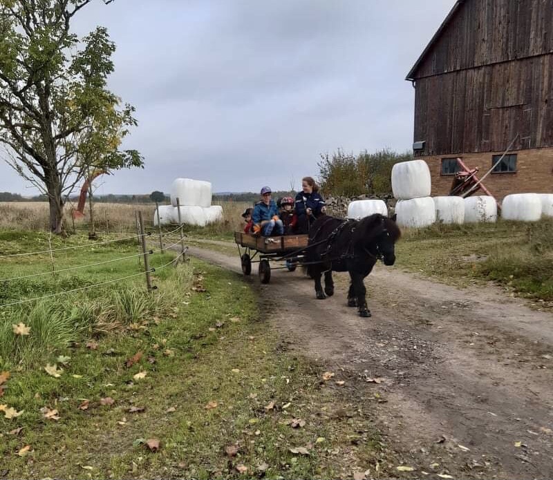 Idag började vi dagen med en sväng med stora ponnyvagnen. Först åkte vi till grisarna och gav dem mat.