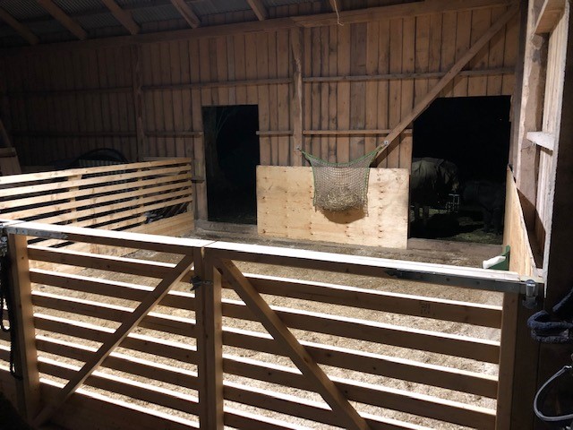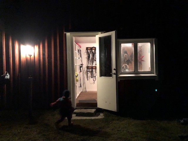 Självklart har även den lilla sadelkammaren fått lampa och uttag så vi har kunnat koppla in ett element, och en liten utomhuslampa så man hittar dit.