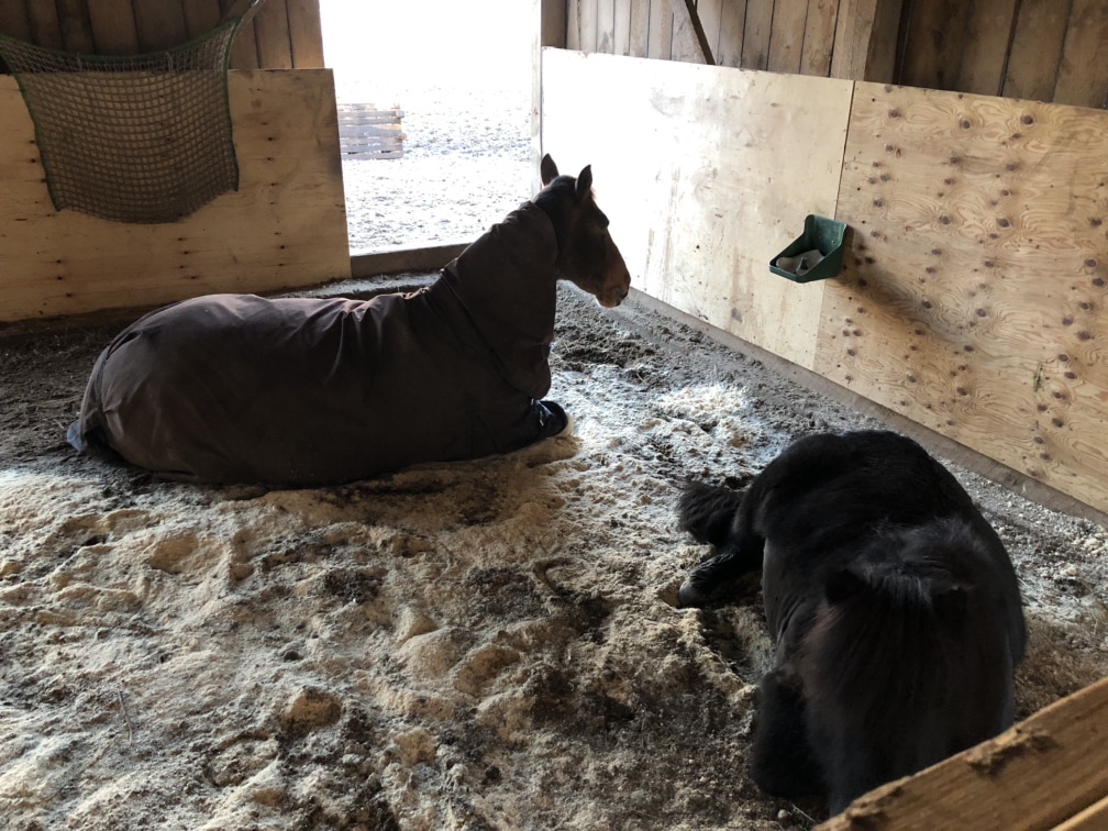 Idag har jag därför jobbat hemifrån för att hinna med lite jobb mellan lämning och hämtning på förskolan. Vid lunch var jag ute och fodrade lunch till fåren och ponnyerna och möttes av den här goa synen. Skönt att ligga inne och vila medan regnet strilar ner ute.