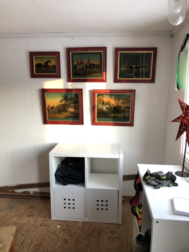 Efter lunch åkte Axel ner till sjön med dina föräldrar och barnen, en lite skridskoåkning. Jag red Kaprifol en sväng, och så fick jag äntligen upp tavlorna i sadelkammaren! När pappa var här och hälsade på för ett par veckor sen hade han med sig gamla fina jakttavlor han hittat på auktion. Precis vad jag hade tänkt sätta upp på väggen här inne! Tog ett tag innan jag kom till skott dock, men nu sitter de där!