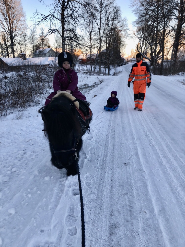 Vi slängde lite skräp, pantade burkar och handlade och så hämtade vi ett lass spån. När vi kom hem var det dags för lunch men sen gick vi ut igen. Lite spån åkte in i ligghallen, stora ponnyvagnen fick ett nytt däck och vi gick på ponnypromenad! Först Nora på ryggen och Loke i pulkan.