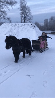 I fredags kom mormor under eftermiddagen och då stämplade jag ut från mitt kontor nere i källaren. Vi gick ut till stallet och satte selen på Assim och körde iväg mot förskolan, med släden! Det är lite för lite snö bitvis, främst på asfaltsvägen där snön är bortkörd, men det funkar att köra ute vid kanten och så tog vi vägen över ett par åkrar som ska plöjas upp. Mormor passade Assim när vi var framme, så gick jag in och hämtade barnen som precis ätit mellanmål. De blev glad av både mormor och släden!