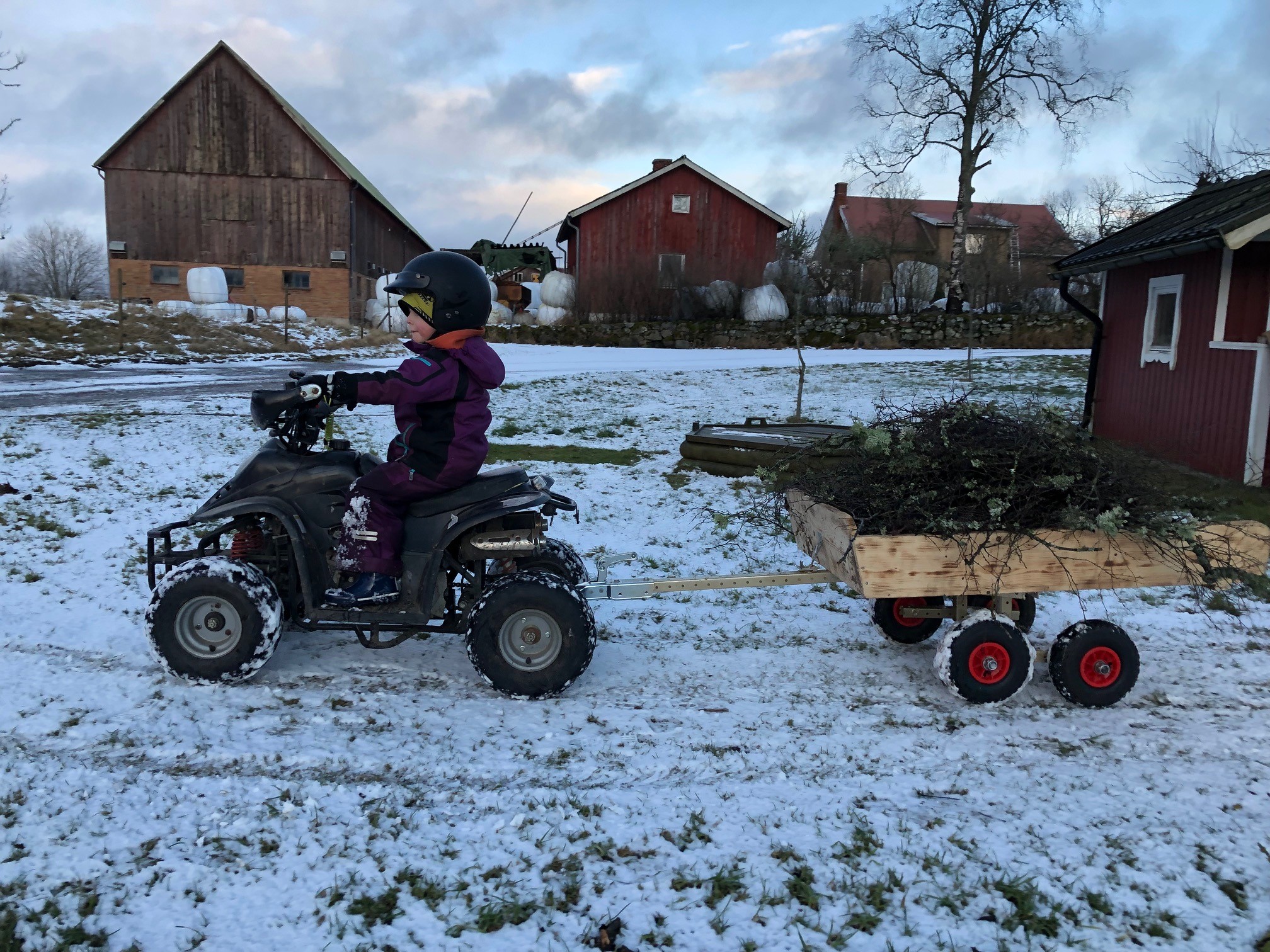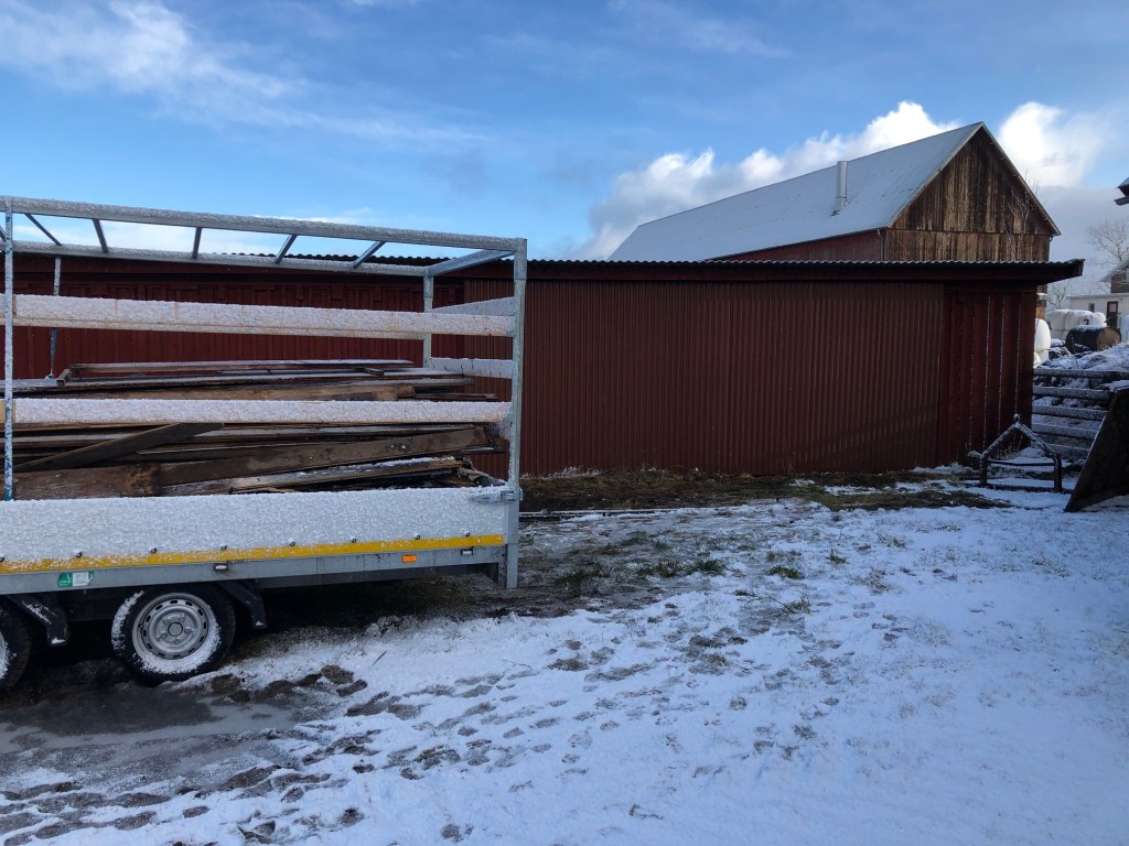 När hästarna var ute i hagarna igen satte jag igång med att fylla Farfars kärra med brädhögen utanför fårhuset. Jag hann nästan klart innan Axel kom och hjälpte mig med det sista. Tippen är ju stängd på söndagar så tömma får vi dock göra en annan dag, gissningsvis nästa helg. Vi hade även en ”körlektion” med traktorn och balgripen eftersom jag kommer få köra en höbal till hästarna själv i morgon eller på tisdag medan Axel är i Lovisagruvan. Jag ställde in en höbal till fåren och lyckades riktigt bra om jag får säga det själv.