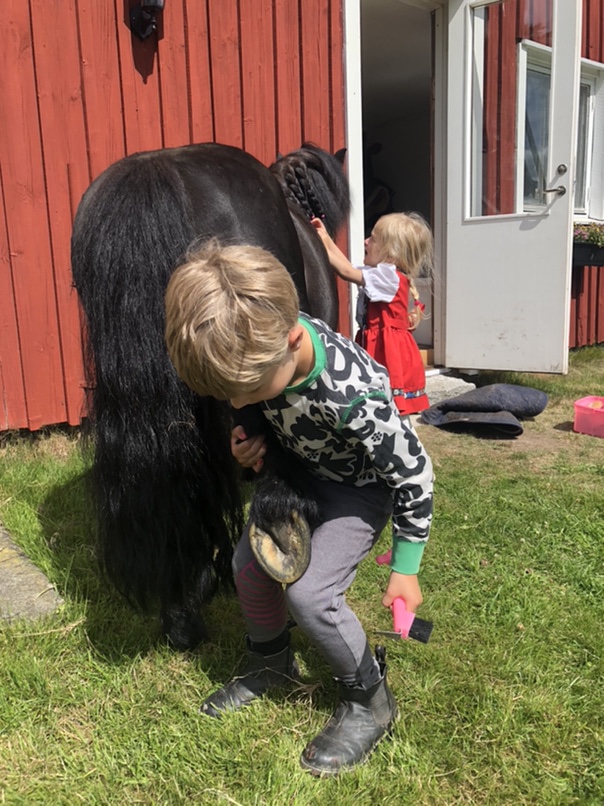 I morse följde barnen med ut och vi gjorde inordning båda hästarna inför dagens tömkörningsträning. Det var ett tag sen vi hade sån träning nu och vi testade en ny tränare då Emeli inte riktigt haft möjlighet att komma ut. Den nya heter Angelica och var över förväntan! Jättebra träningar och jag fick lite ”läxor” på båda hästarna som jag kan träna på tills nästa gång, och då inte enbart via tömkörning utan även ridning/körning. Kul!