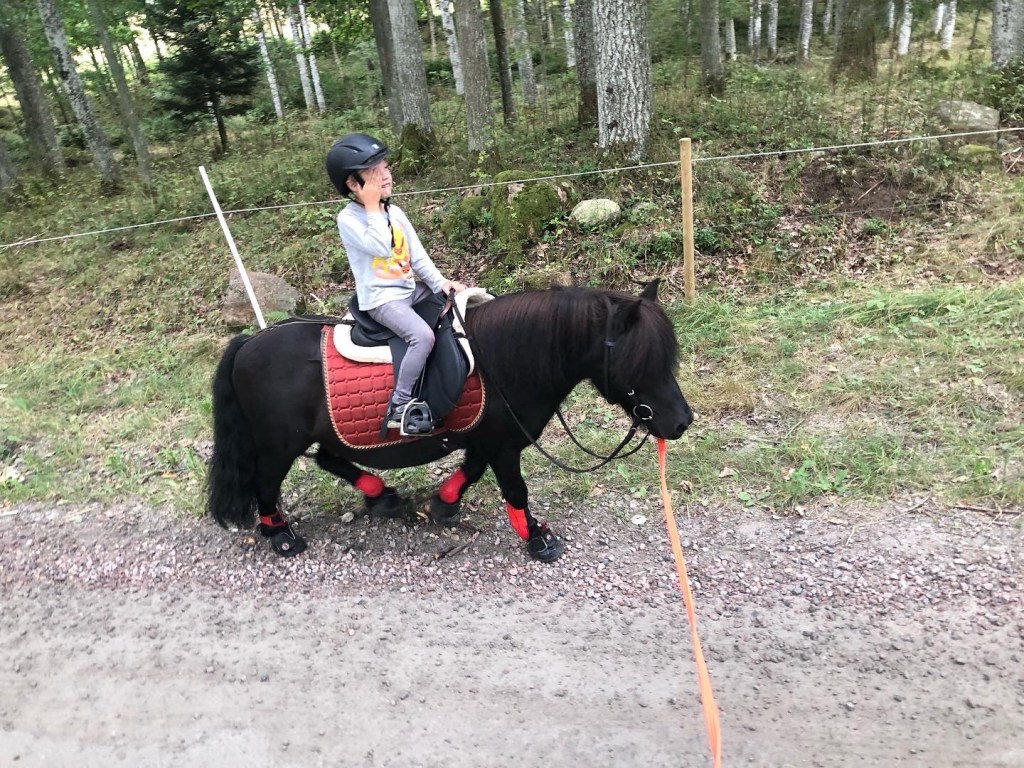 Sen gick vi iväg på promenad och när vi kommit ner på grusvägen fick Loke rida själv. Det är sällan han vill det så det var roligt. Assim skötte sig utmärkt.