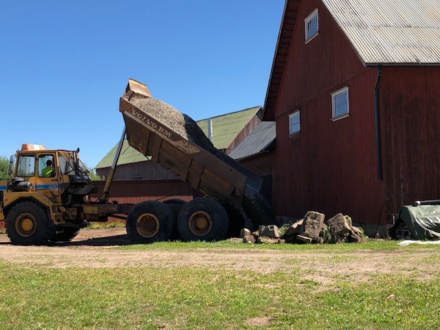Sen var det dags för nästa dumperlass; två stycken med lite finare grus som lagts på toppen. Martin har även hämtat ett lass singel och dumpat med sin kärra, inne i fårhuset.
