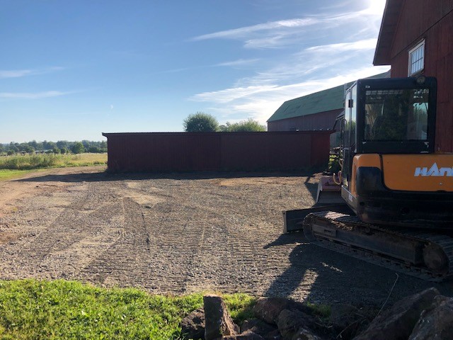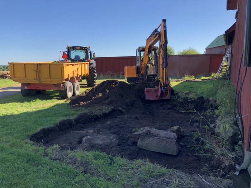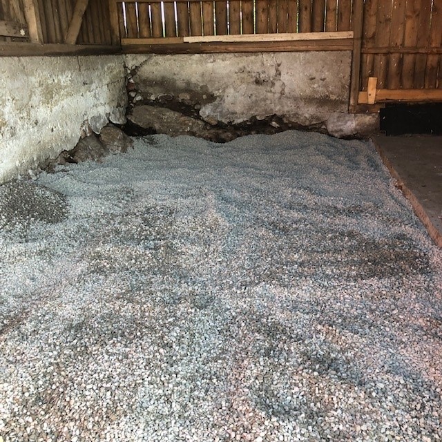 Vi har ju som vanligt flera projekt igång samtidigt, men det finns ju många fördelar med det. Martin har ju varit här ett gäng gånger med sina maskiner och nu senast spred han ut gruset inne i förlängningen av fårhuset. Här inne ska vi nu padda gruset, gjuta betong och putsa nederdelen av väggen.