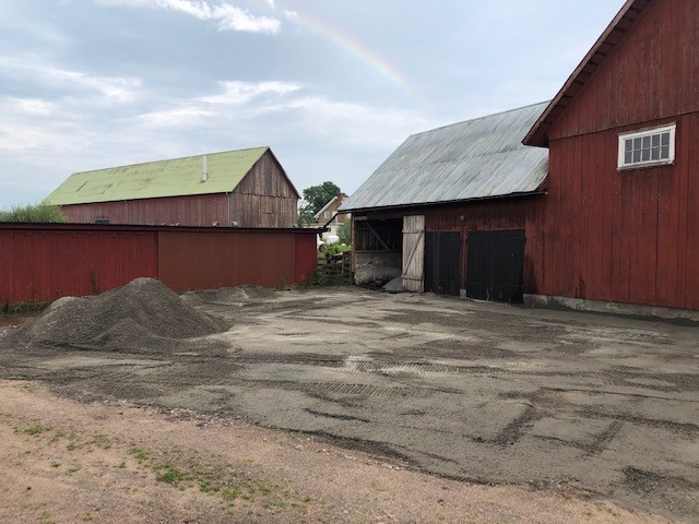 Här står vi just nu, det sista gruset har inte spridits ut ännu för det är väldigt blött och kladdigt efter regnet, vid sågverket. Och detta ledde ju då till att vi har bestämt att när Martin ändå är här kommer vi gräva ner en dräneringsbrunn (eller vad det nu heter) i hörnet på sågverket, och lägga ett rör under vägen och bort mot vinterhagen. Vi flyttar väl mest problemet längre bort, men då står i alla fall inte byggnaden i en sjö som den brukar göra när det regnat, och vi får bort lite vatten från gårdsplanen. Så fortsättning följer!