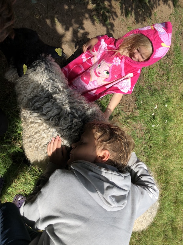 När vi var hemma igen tog vi gårdsrundan och tittade på de andra djuren; hästarna, hönsen och lammen. Solen sken och då passade det ju bra med en glass sen! Äkta sommarglass där vi fyllde rån med glass, strössel och sås. Gott!