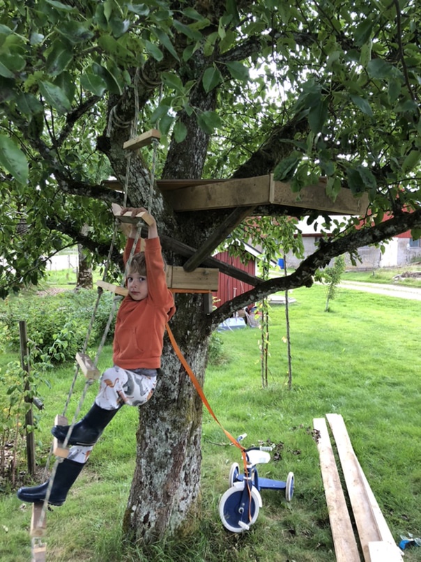 Under eftermiddagen var vi lite flitiga ute. Jag och Nora målade portarna till lilla lösdriften och Axel och Loke fortsatte att bygga på trädkojan/plattformen i päronträdet.