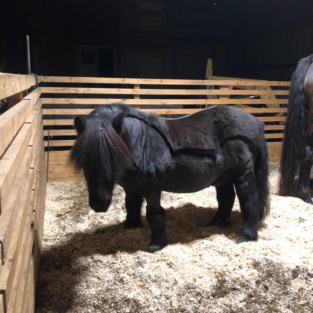 Fodret är lite knepigare, eftersom Kaprifol är en stor häst som gärna äter lite då och då och Assim är en liten konstant hungrig ponny. De får en liten påse hö tre gånger om dagen, och fram tills nu har jag även haft ett nät på väggen som sitter rätt högt upp där tanken är att bara Kaprifol ska kunna äta. Men när det är lite mindre mat i nätet hänger det längre ner, och då är han genast där och moffar i sig, den lilla ponnyn. Det blir ju dessutom inte den mest naturliga ätställningen för Kaprifol eftersom det är så högt upp, så nu klurar jag på en lösning där Kaprifol äter över väggen till ligghallen i stället.