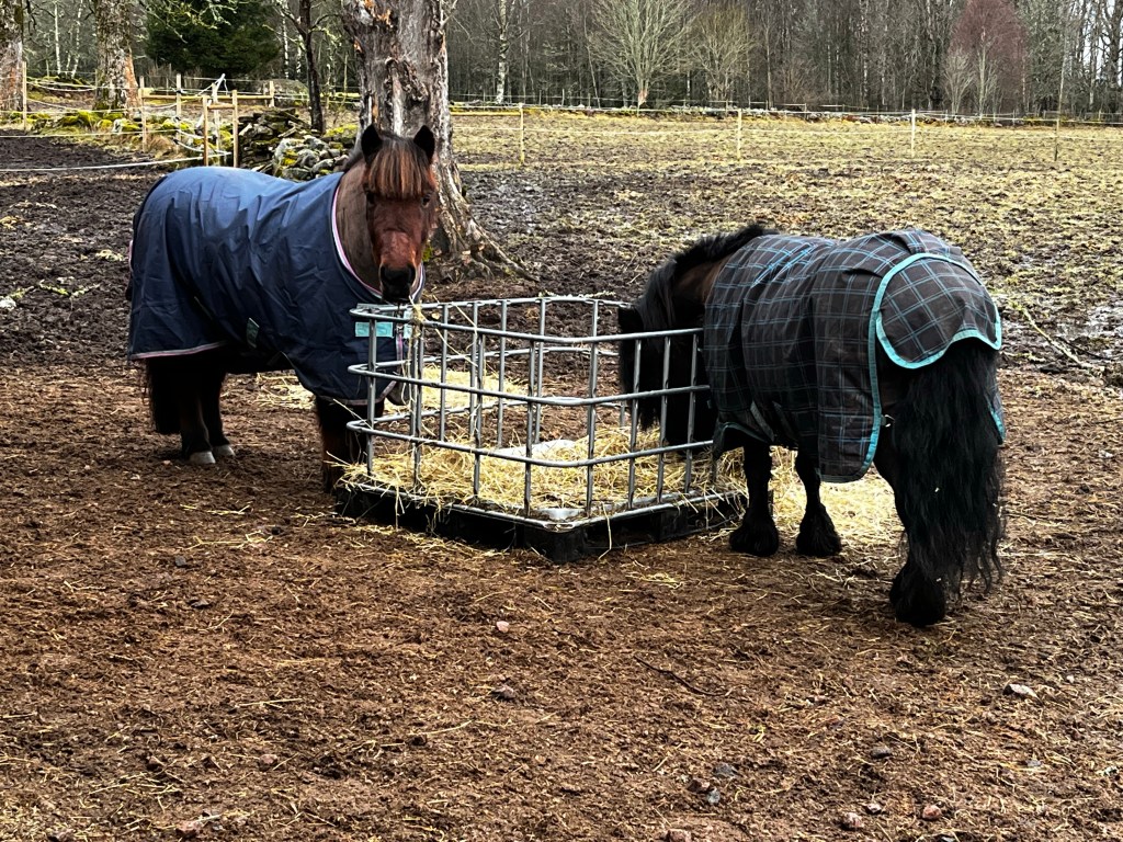 I lördags kom det en ny ponny till gården, om än för en tidsbegränsad tid. En vän har fått ta bort sin storhäst vilket lämnade sällskapsponnyn ensam på gården, så den har fått flytta in till Kaprifol och Assim. Ihopsläppet gick väldigt odramatiskt även om de inte är bästa kompisar ännu. Assim gillar att kunna bossa runt på nån i sin egen storlek och Kaprifol tycker mest att de är onödiga varelser i hennes närhet. Hon skulle mycket hellre vilja komma in till hagen bredvid där äntligen Alie har börjat gå igen efter en vinter i sjukhage. Nu kan de i alla fall gosa över staketet.