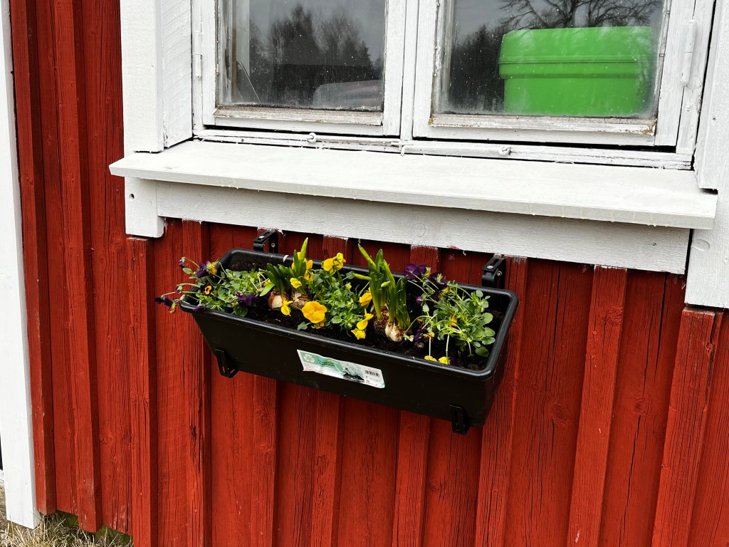 Vid lunch blev det grillad korv vid brasan, Nora blev dock kall så jag och hon intog korven inomhus. Men hon blev snart varm igen så även eftermiddagen kunde spenderas utomhus. Vi planterade inköpta vårblommor, krattade lite hö och städade i ladan.