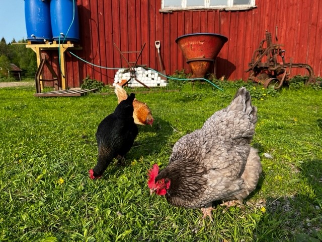 Hönsen tuffar på, åtta hönor och en tupp för tillfället men en höns ligger på åtta Hedemora-ägg från en ”granne” så runt den kommande söndagen bör det bli tillskott i form av kycklingar. Roligt eftersom vi inte hade några ruvvilliga hönor förra året utan kläckte fram nån omgång i maskin. Det är lite dåligt med ägg just nu, oklart om de gömmer ägg ute eller om vi har problem med kråkor som äter äggen igen, precis som förra året. Kanske en kombination? Det räcker ju till oss men blir inte så många till försäljning just nu vilket ju är tråkigt.