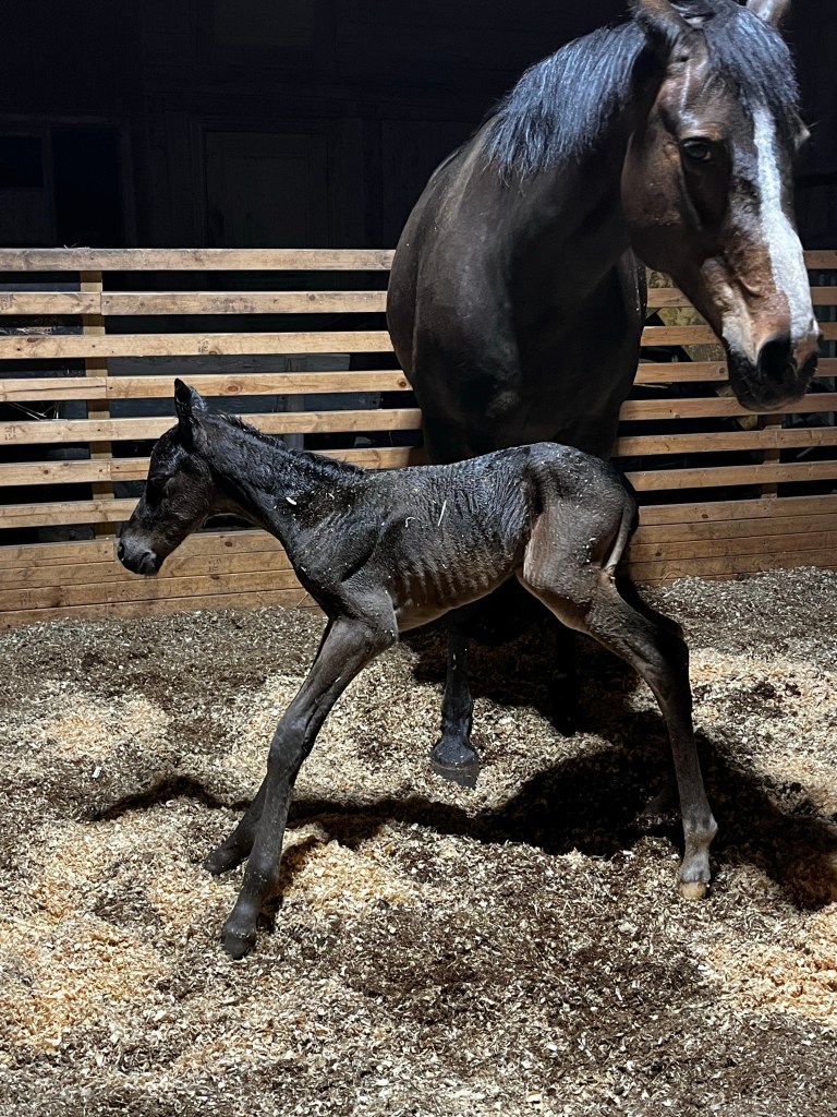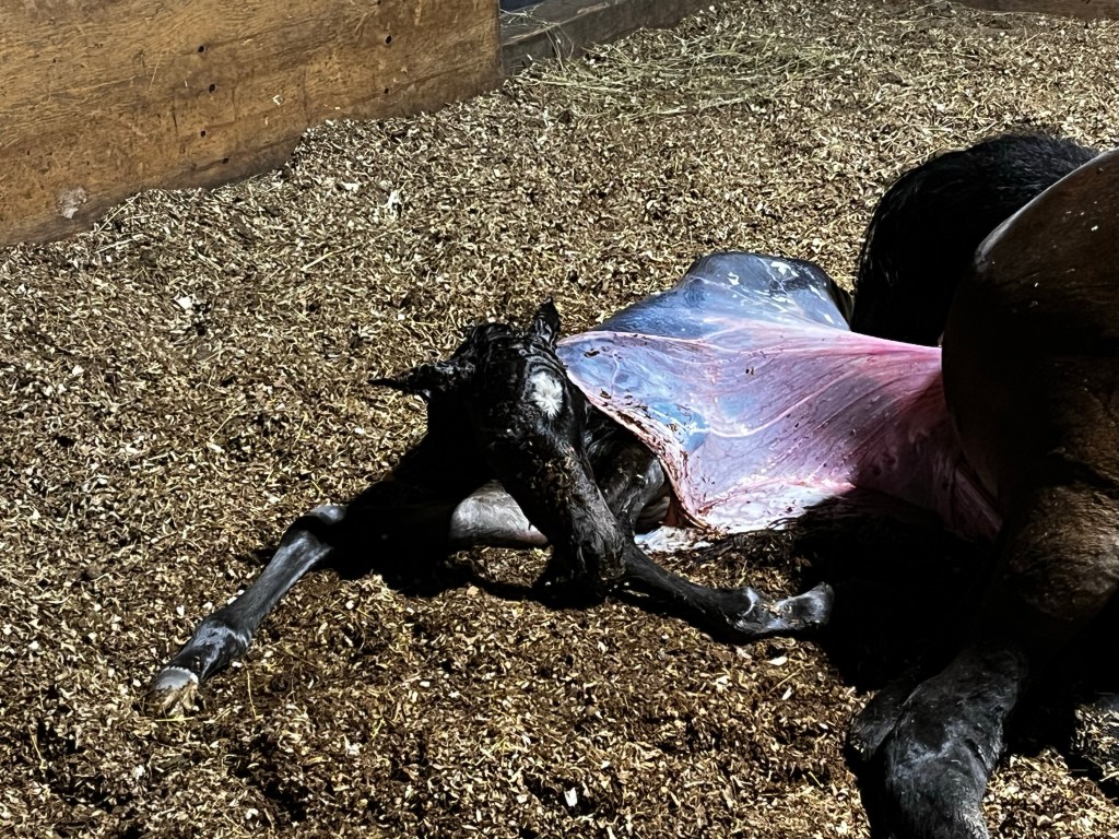 Assim fick lite mer hö så han skulle hålla sig ur vägen och så satte jag mig för att vänta. Hög puls vill jag lova och minutrarna kändes stundtals evighetslånga. Klockan 22.35 var fölet ute, fosterblåsan sprack fint och Kaprifol vände om och tittade på sin son och började direkt humma och smågnägga hur fint som helst.