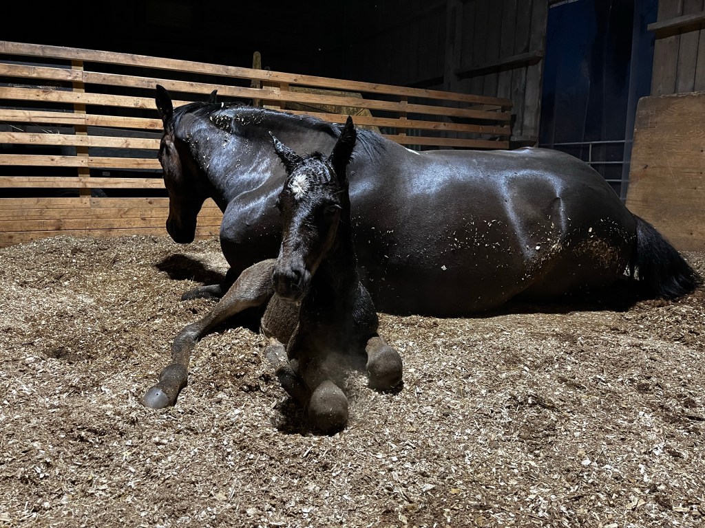 Vid det här laget hade jag ordnat mat och vatten till Kaprifol i ligghallen, och stängt ute Assim så han inte skulle ge sig in och skapa turbulens. När han närmade sig dörrarna visade Kaprifol tydligt att han inte var välkommen ett endaste dugg, och jag ville heller inte att fölet skulle riskera att trilla ut mitt i natten. Så den nyblivna mamman och fölet fick bo inne resten av natten och jag kikade till dem genom kameran ett par gånger och allt var lugnt och fint och fölet kom åt att dia flera gånger.