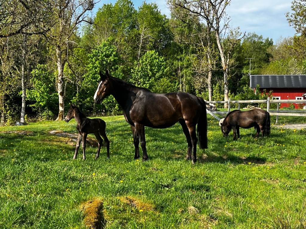 Klockan ringde 06.30 på måndagsmorgonen och jag och Nora var först upp och gick direkt ut för att se till hästarna såklart. Allt såg fint ut, pigga och glada! Assim fick en tuss hö och Kaprifol hade fortfarande kvar så där blev det ingen påfyllning. Fölet var uppe och var nyfiken, men försiktig. Nu när balansen kommit ytterligare mer på plats kunde man ändå se att det är ju en fin kille alltså! Raka och fina ben också, han trampade igenom lite för mycket i några av kotorna på morgonen men det tyckte jag rättade till sig bra redan över dagen.