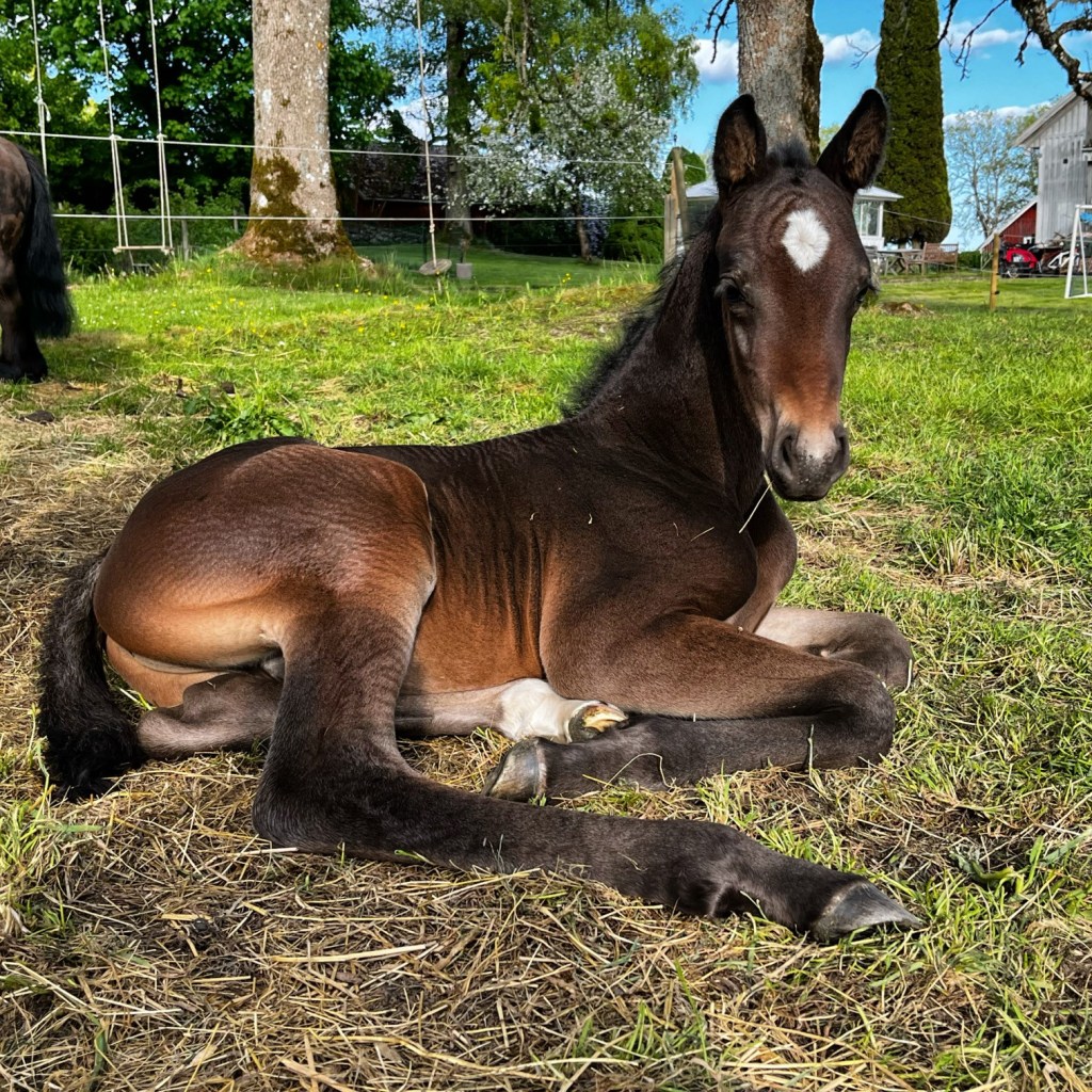 Nu är han äntligen här, Kaprifols föl! Och ganska så punktlig också, eftersom jag satt BF till 20 maj blev han bara en dag ”sen”. Under söndagen fick Kaprifol och Assim gårdsplanen till hage för att äta gräs och göra jobbet som vår trasiga gräsklippare inte gör just nu. Det småsroppade lite från Kaprifols juver och lämnade kladdiga rester på hennes bakben. Vid sextiden fick de stängas in i sin hage igen och nu rann/sprutade mjölken ut och den var nu vit i stället för grådassig som tidigare. Jag skickade filmen till en vän som fått ett gäng föl och hon svarade direkt; Föl inom 24 timmar! Spännande tänkte jag, men trodde fortfarande att det var närmare 20 än 10 timmar kvar i så fall.
