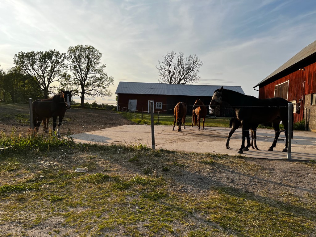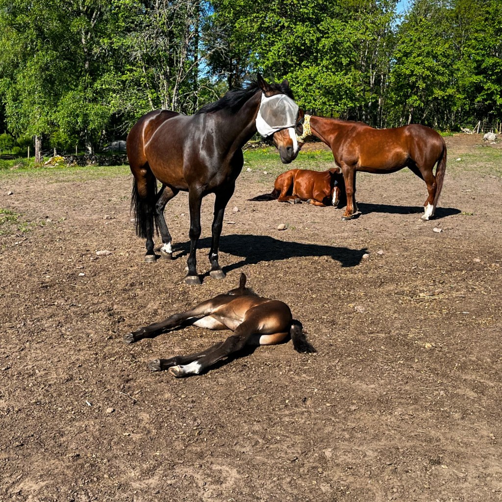 När den största nyfikenheten lagt sig tog jag bort staketet och hästarna rörde sig knappt ur fläcken. Kaprifol har gjort sin sak tydlig och gick nåt varv runt Kotten och visade var gränsen gick så att säga. Vid ett tillfälle närmade sig alla fyra hästar från var sitt håll nästan och det var lite i en som situation de började springa förra året med det stoet och föl, men Kaprifol hade pondus nog att stå kvar och hötte med bakhovarna i luften och de andra hästarna fattade grejen direkt.