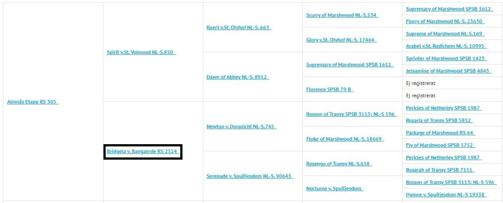 Här är Assims pappas del i stamtavlan, och där ser man Assims farmor; shetlandsstoet Bridgela v. Bangaerde RS 2524 (som för övrigt är född i Westwoud i Nederländerna, och importerad till Sverige).