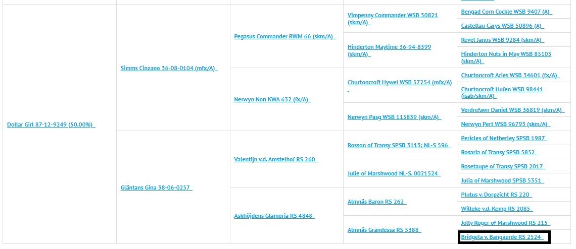 Här är Assims pappas del i stamtavlan, och där ser man Assims farmor; shetlandsstoet Bridgela v. Bangaerde RS 2524 (som för övrigt är född i Westwoud i Nederländerna, och importerad till Sverige).