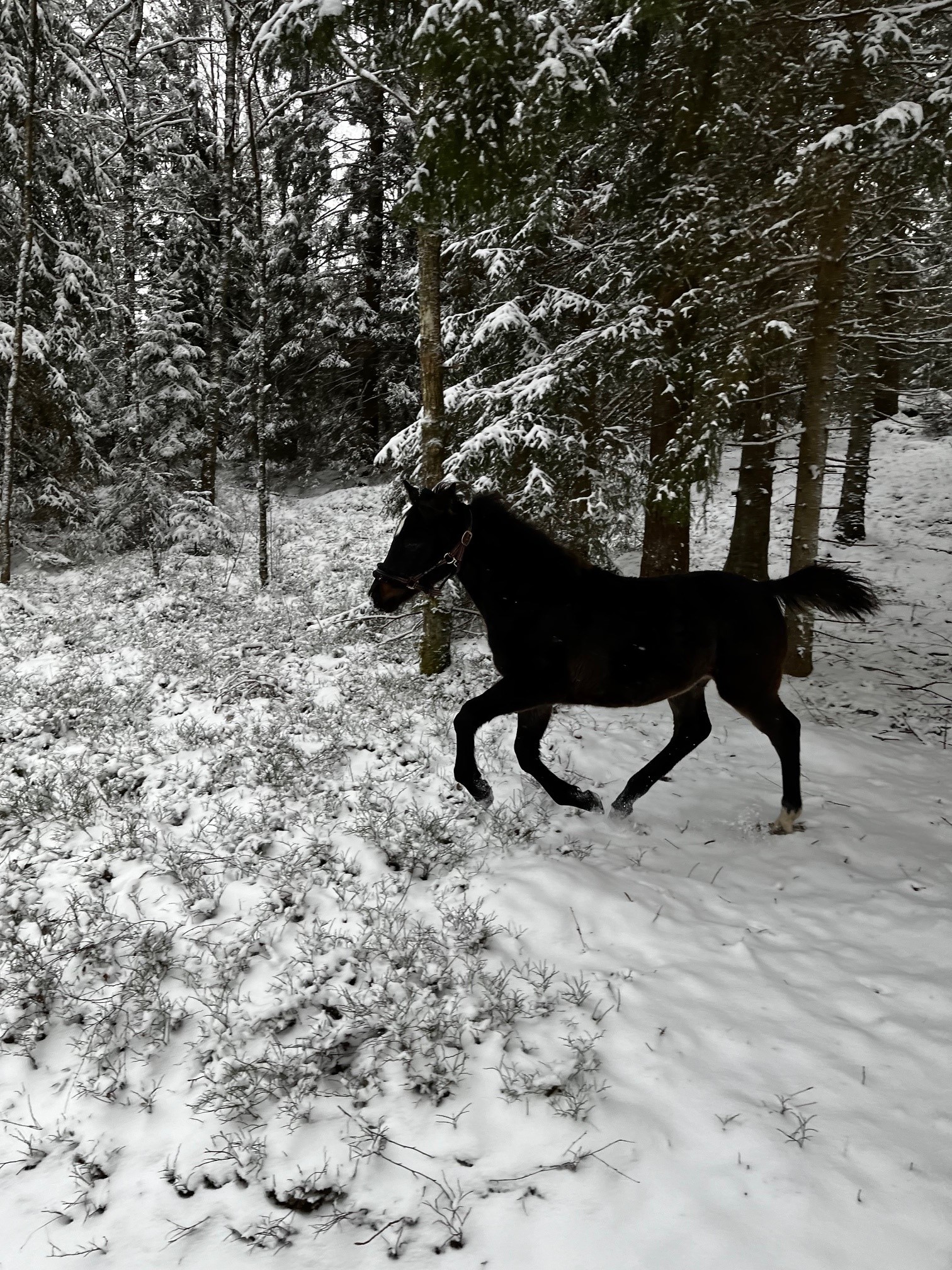 Jag har även tränat vidare på att lämna honom kvar i hagen när jag grejat med Kaprifol i stallet och på ridbanan så snart ska jag testa att rida bort från gården en liten kortis medan han är kvar i hagen och se hur han löser det. Jag har börjat sätta igång Kaprifol lite de senaste två veckorna också, kanske mest för att hon har haft väldigt tjocka bakben som även utvecklade sig till lymfangit på hennes ena bakben. Hon har fått penicillin vilket hjälpte det värsta, men en del svullnad är fortfarande kvar så hon behöver röra på sig, gärna varje dag. Så det har blivit lite motion på ridbanan utan Kotten, med Kotten och så har jag även skrittat ut i skogen med Kotten lös och det tycker han ju är väldigt roligt. Nu börjar han dock bli lite väl kaxig så kanske får jag ta honom i lina snart så han inte försvinner iväg för långt… Känns dock inte jättelockande att ha honom i lina eftersom han är rätt sprallig, men vi får se.