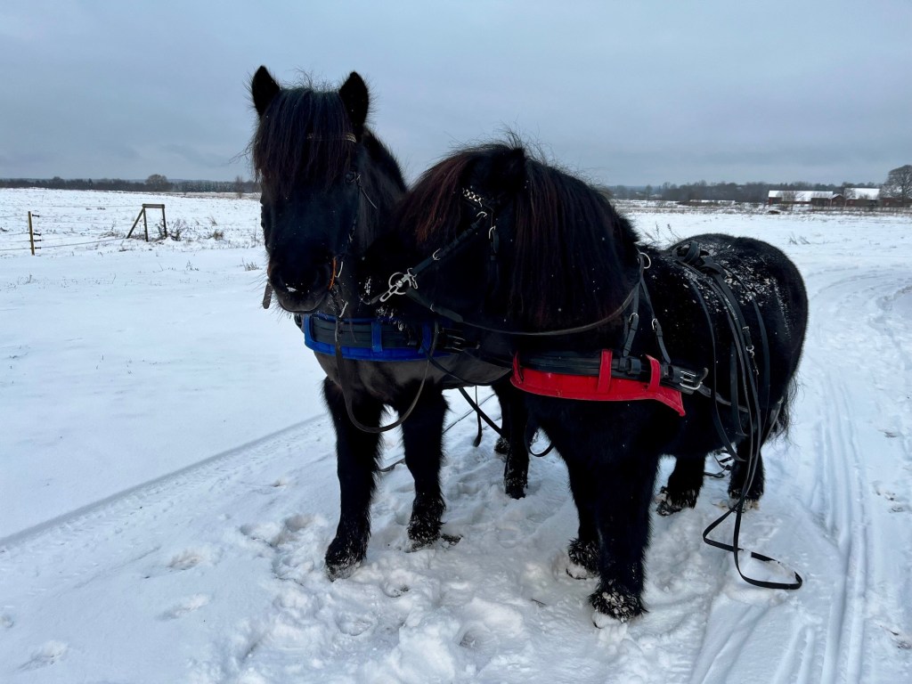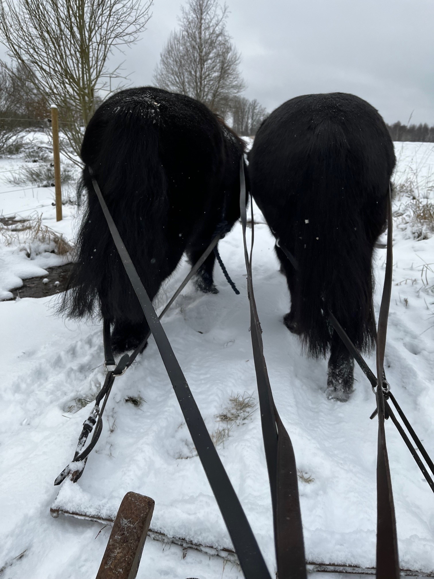 Ponnypojkarna mår fint också, de har dock fått ”stå tillbaka” lite nu när jag varit sjuk och fått prioritera Kaprifols rörelse lite, men Nora har ridit lite, det har blivit lösgalopp på ridbanan och häromdagen fick jag ett infall att testa köra dem i par. Jag har ju inte alls grejer till detta men lite gick ju att plocka ihop, och få en känsla för om det alls är möjligt. Förra året fick jag en slags lunnebåge-kälke av min bror så den tänkte jag var en bra grej att testköra i snön, så det gjorde jag. Och det gick ju inte alls så dåligt ändå!