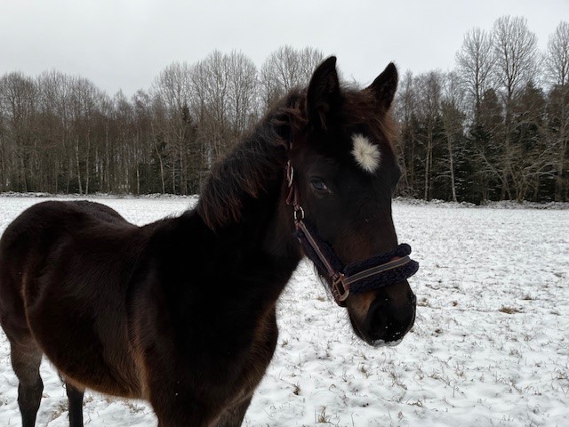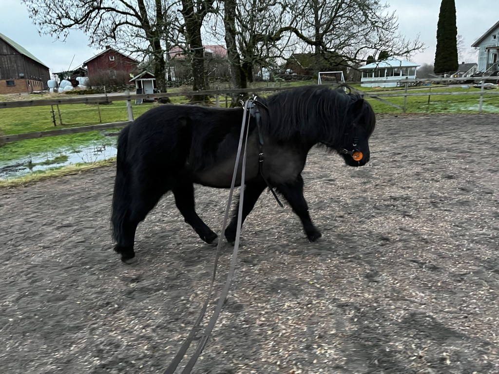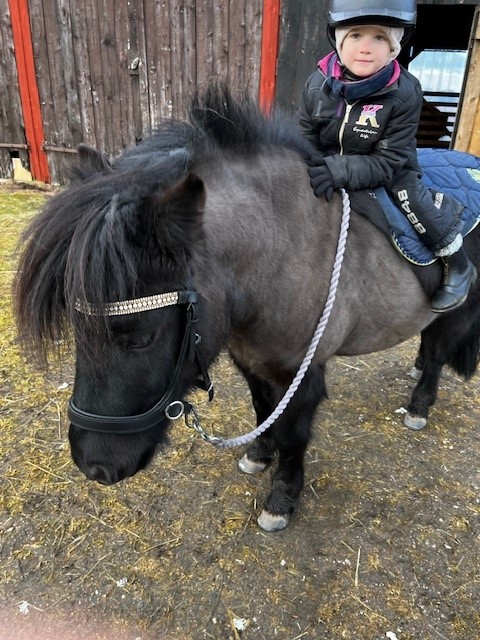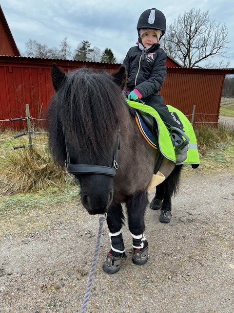 På söndagen blev det såklart ridning på förmiddagen för Nora (och experiment för Loke och Axel) och vi testade de nya grejerna på Domino under en ridtur både i skogen och lite på ridbanan. På ridbanan ville Nora rida själv och fick det såklart (sen att jag går före och ponnyn ändå följer mig mest är ju en detalj vi kan jobba på senare…!) och hon travade även helt själv en gång. Domino skötte sig galant!