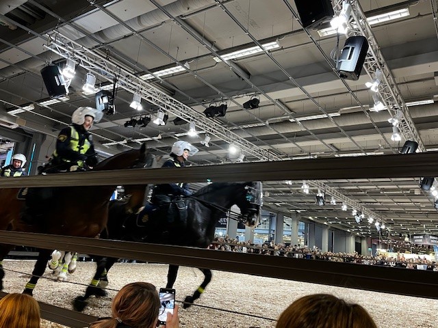 Inne på Svenska mässan fanns det såklart en himla massa grejer att titta på och fundera på om man ville köpa något och sen var det även lite uppvisningar i paddocken där inne. Vi växlade lite mellan de två olika och i paddocken såg vi bland annat uppvisning av westernhästar, frieserhästar, islandshästar och en fjording visade lite körning. Vi såg även poliserna med fyra polishästar rida i formation samt lite miljöträning och, det roligaste enligt Nora, det kom en tjuv som hästarna och poliserna fick fånga!