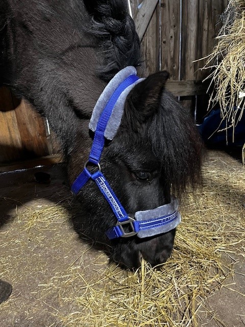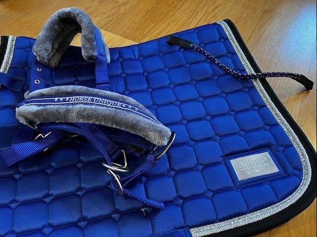 Sen fanns det ju såklart måånga fina saker att köpa på mässan. Nora ville gärna välja ett schabrak och såg ett blått väldigt tidigt som hon tyckte om, men vi sa att vi köper ingenting nu direkt utan vi tittar runt på allt först!. Men det var inget schabrak som överträffade detta så till sist blev det detta. Och vi hittade även ett tjusigt pannband och en fluffig grimma i samma färg som fick följa med hem, till Domino. Måste erkänna att jag är väldigt förvånad över färgvalet! Det var ju inte så att det saknades rosa och lila grejer, men hon har faktiskt mer och mer utvidgat vyerna även hemma med att vilja ha andra färger på sig så helt oväntat kanske det ändå inte var.