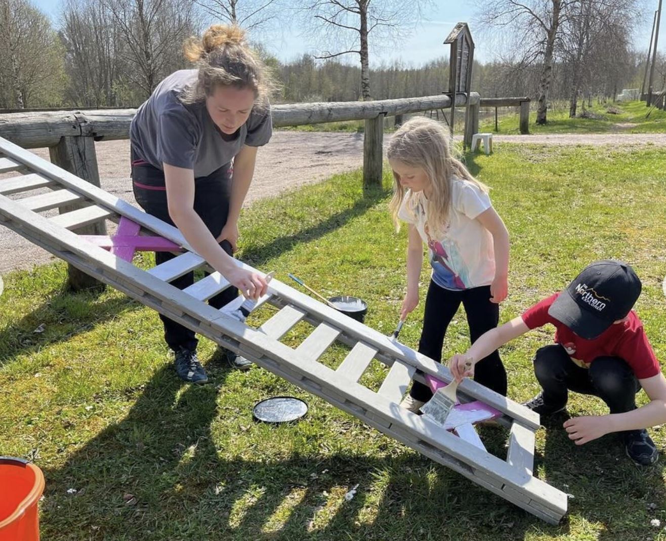 Vi inledde dagen med att åka till Gäsene på arbetsdag 10-14. Jag, Axel och barnen fokuserade på att korta av tre hoppgrindar till rätt längd (vi kortade av alla våra bommar i höstas på grund av vikt-krav) och de fick även färg på sig efteråt. Vi grillade hamburgare tillsammans och njöt av solen!